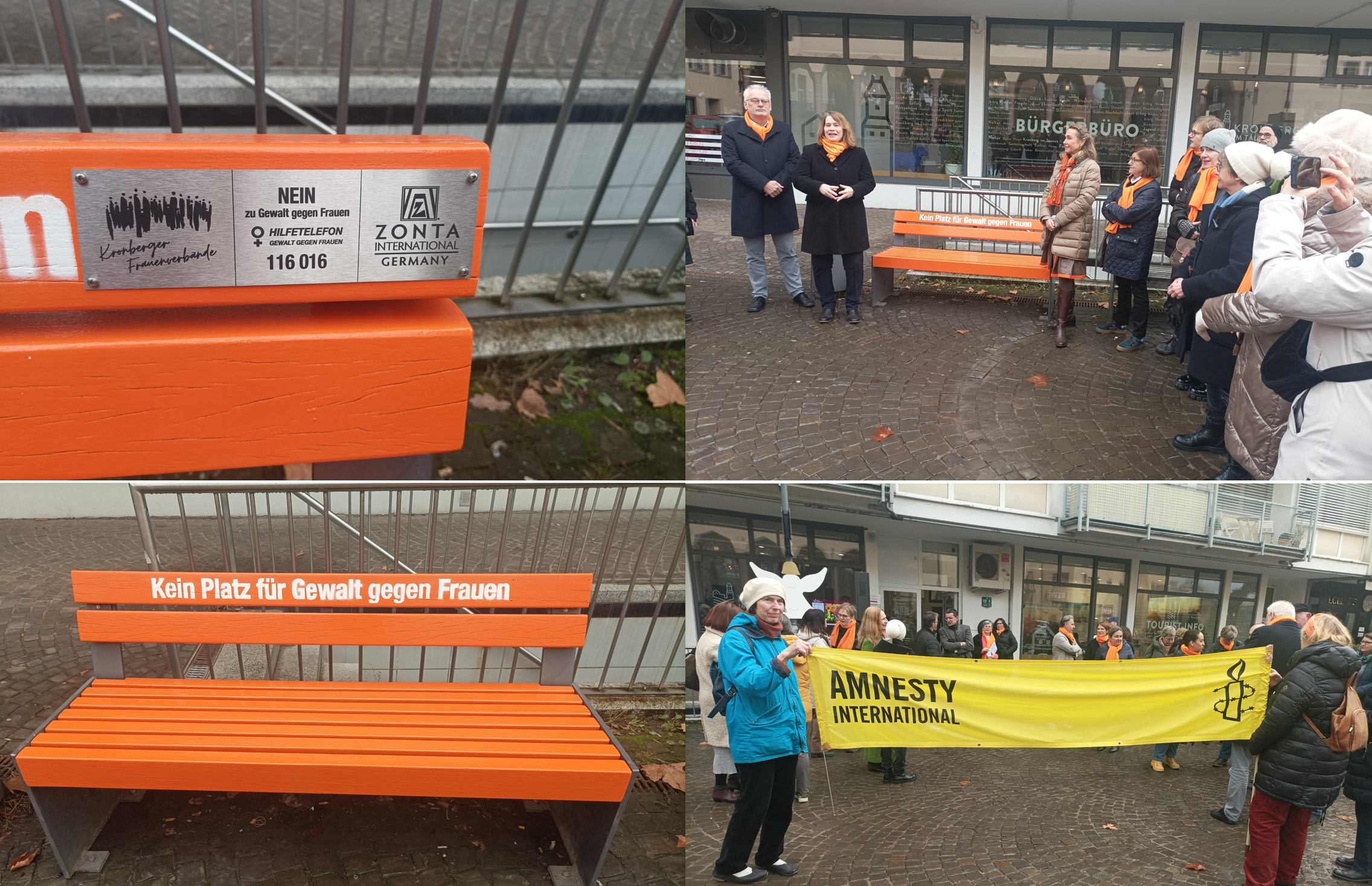 „Kein Platz für Gewalt gegen Frauen“ lautet die klare Botschaft, die künftig von einer orangefarbenen Bank auf dem Berliner Platz ausgeht. Am 25.11.2025 wurde die Bank von der Vorsitzenden der Kronberger Frauenverbände Ulrike Zymolka, der Vertreterin von Zonta Bad-Soden/Kronberg Frau Ulrike Billstein und Bürgermeister Christoph König eingeweiht. Auf diesem Weg soll unübersehbar wie dauerhaft an die Wichtigkeit von Schutz, Solidarität und Prävention erinnert werden und ein sichtbares Zeichen gegen Gewalt gesetzt werden. Die Aktion wurde unterstützt von der AI Ortsgruppe.